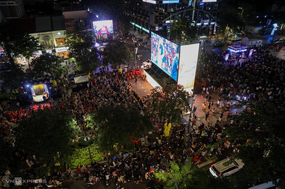 Từ 18h, hàng nghìn người có mặt tại phố đi bộ Nguyễn Huệ (quận 1) để theo dõi trận đấu giữa tuyển Việt Nam gặp Indonesia ở vòng bảng bóng đá nam SEA Games 31. Tại đây, 5 màn hình led kích thước lớn được lắp đặt phục vụ người hâm mộ.Việc trực tiếp bóng đá ở phố đi bộ Nguyễn Huệ là sự kiện ngoài trời thu hút đông đảo người dân. Tuy nhiên, hơn hai năm qua, hoạt động này bị ngưng để phòng dịch. Lần gần nhất, TP HCM tổ chức phục vụ bóng đá tại đây là SEA Games 30 cuối năm 2019 – lần U23 Việt Nam đoạt HC vàng ở Philippines.Hình ảnh các cổ động viên từ sân Việt Trì (Phú Thọ) qua màn hình led khuấy động thêm không khí náo nhiệt tại phố đi bộ.Các cổ động viên mang theo băng rôn với dòng chữ “Việt Nam thắng vàng”, vừa hô vang cổ vũ theo diễn biến trận đấu.Bé Huynh (5 tuổi) trong trang phục cờ đỏ sao vàng liên tục vẫy cờ, thổi kèn khuấy động không khí trên phố.Anh Nguyễn Văn Phong (38 tuổi, áo đỏ) ăn mừng bàn thắng mở tỷ số của U23 Việt Nam ở hiệp 2. “Trận đấu với Indonesia sẽ khó khăn nhưng tôi tin đội nhà sẽ chiến thắng, qua đó tạo lợi thế lớn để vào vòng bán kết”, anh Phong nói.Cô gái vỡ òa, đứng dậy cổ vũ khi tiền vệ Tiến Linh ghi bàn vào phút thứ 54 của trận đấu.Hơn 20h, hai bên phố đi bộ đông nghịt người đổ về cổ vũ cho thầy trò Park Hang-seo.*Tiếp tục cập nhật hình ảnh.